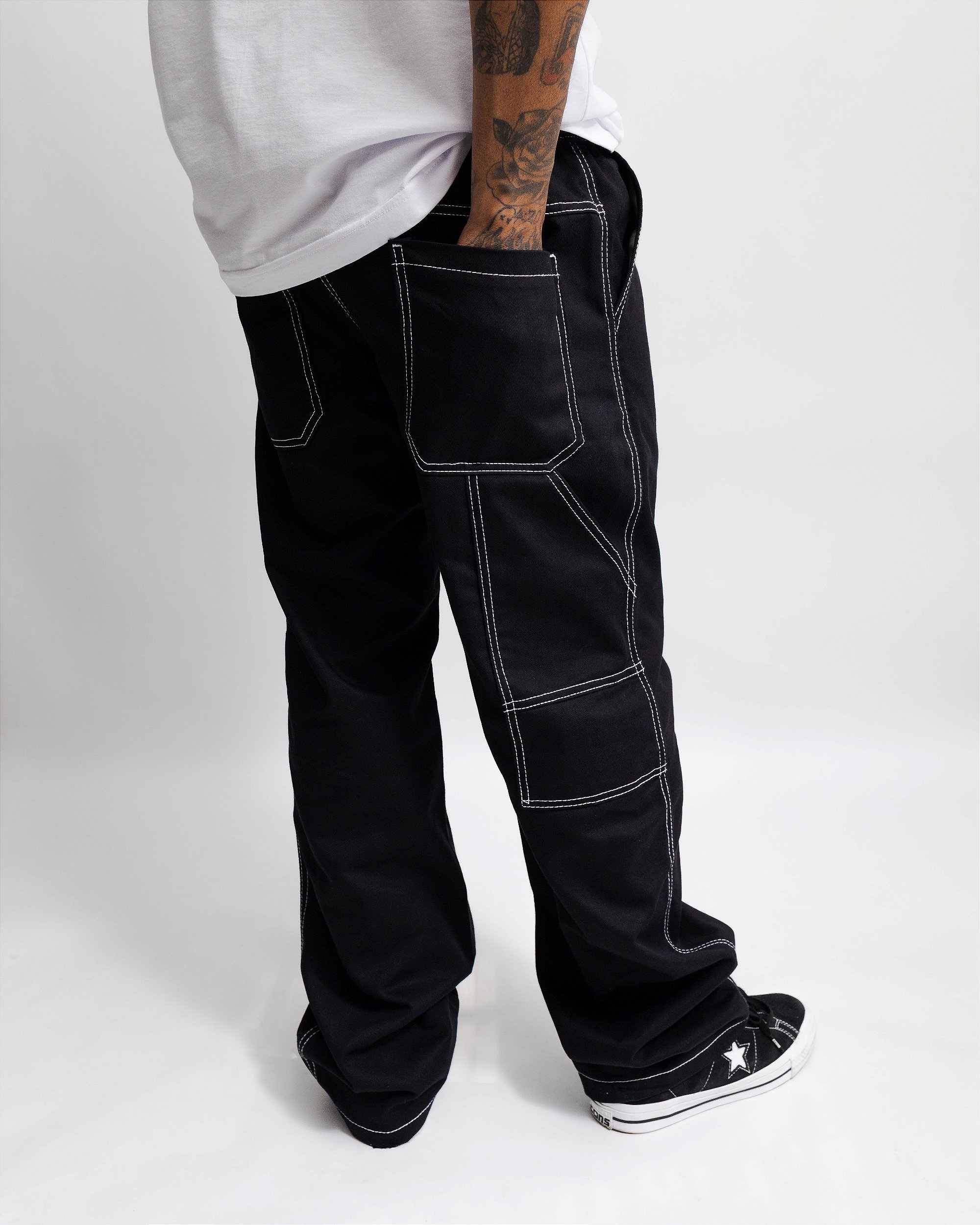 Calça Reta Sarja Carpinteiro (preta linhas brancas)